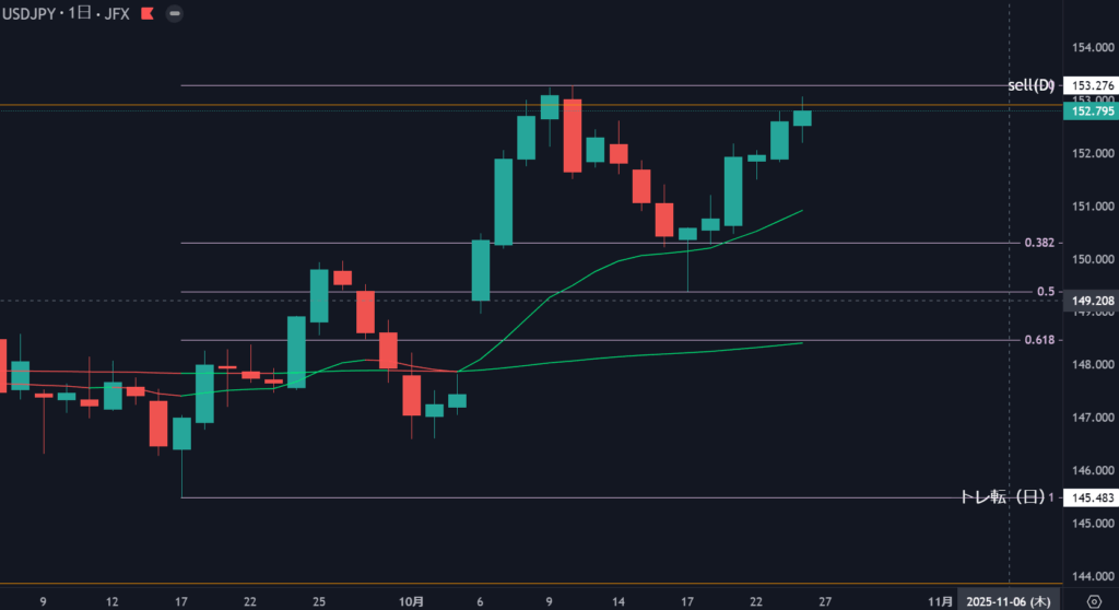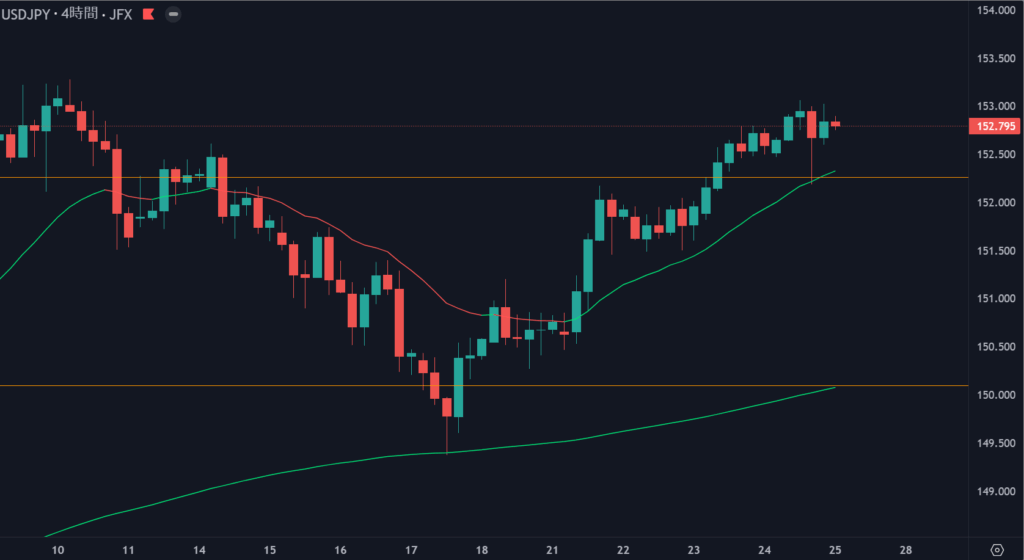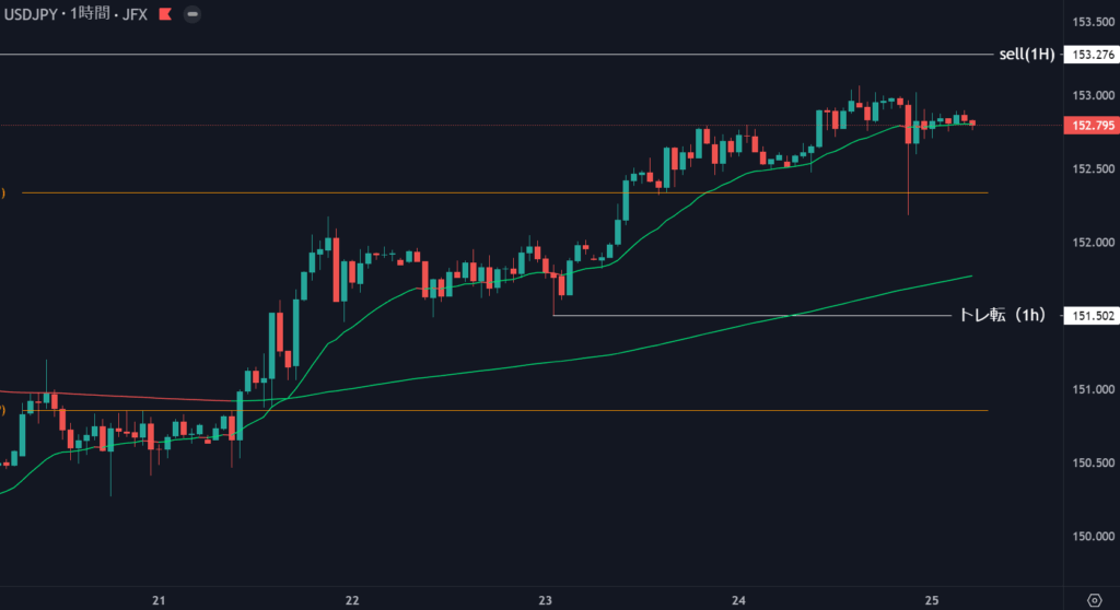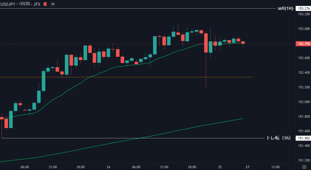 本日のトレードは日足高値である153.30付近を明確に抜けない限りは、4時間足20EMAを下に抜ければショートを狙っていきたいところ。1時間足20EMAも判断に加えて、1時間足20EMAを下に抜けない限りは高値に向かってロング。割ってきたら4時間足20EMAと挟まれるので様子見。再度上げてきたらロングで、4時間足20EMAも割れてショートで日足ダブルトップなるイメージで狙っていきましょう!