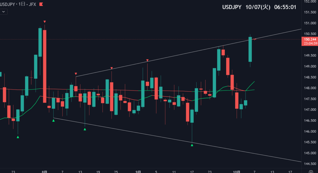 昨日は高市相場で大きく円安に動いていきました。現在も150円にのせていますので、ここからどっちに動くのか。日足のメガホン相場はなかなかですね。