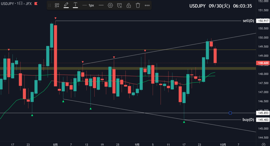 昨日はついに日銀が10月利上げに向かって、地ならしが始まっていきました。野口日銀審議委員から利上げ向かっていくかもしれないぞと捉えられる発言がありました。元々、野口日銀審議委員はハト派で利上げには慎重な姿勢を見せていたのですが、そんな野口日銀審議委員からタカ派的な発言が出たことで相場としては利上げに向かっていくぞと捉えられました。NY時間はレンジで終わって現在は148.50付近で落ち着ています。