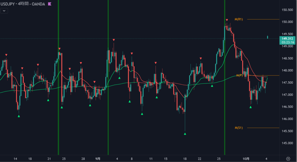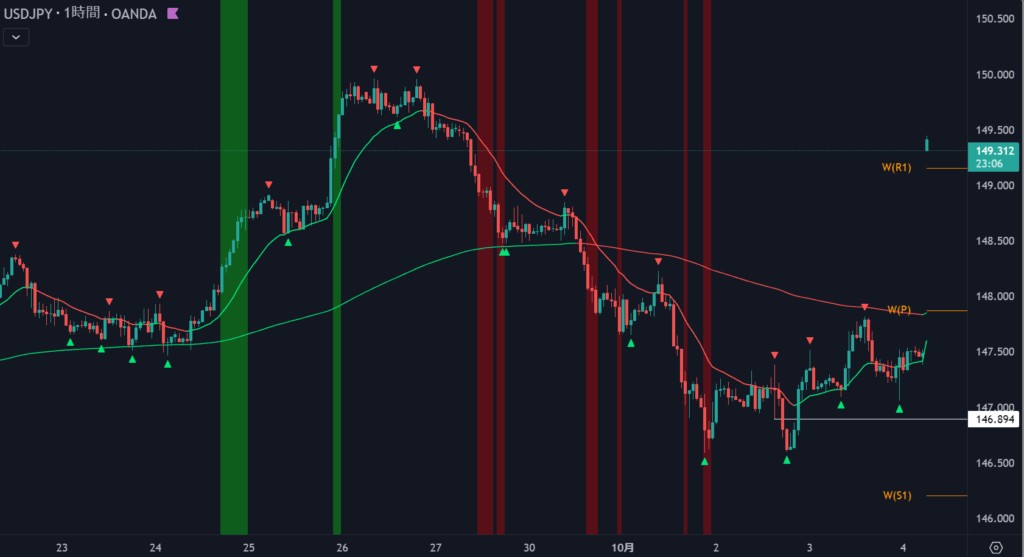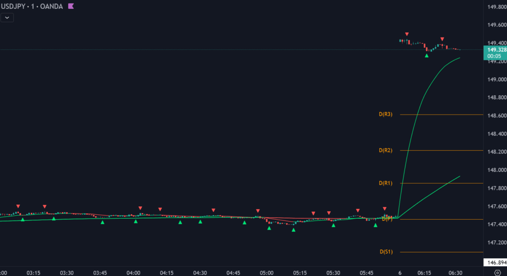 その予想通りの値動きで200pipsほど窓開けて、149.50付近からマーケットスタート