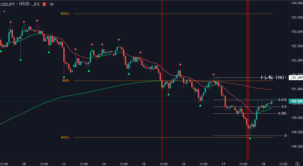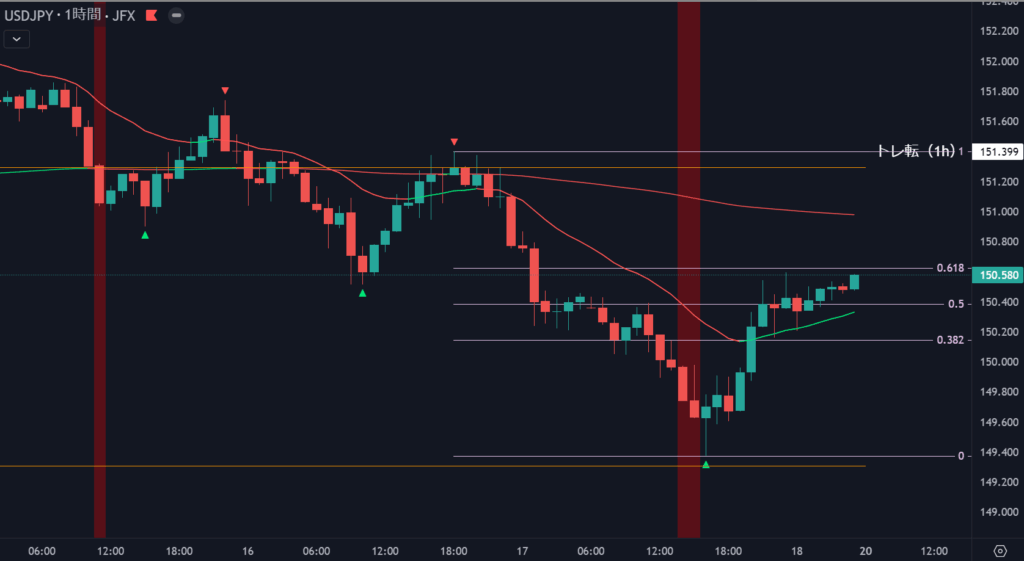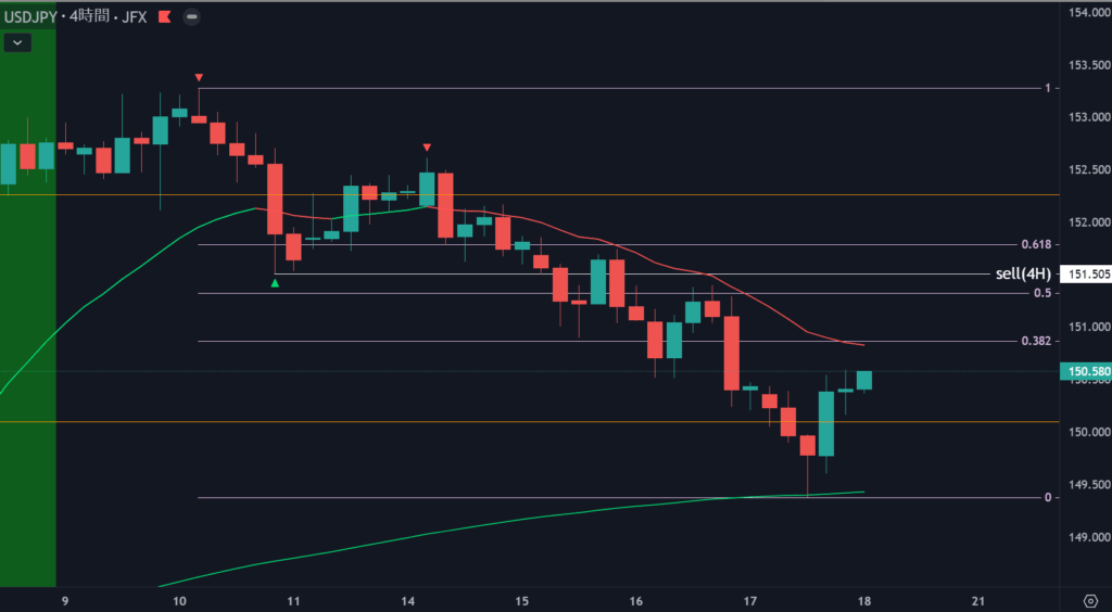 きれいにFOMCの安値から高市相場高値の半値で反発していきました。こういうのも見るとやはり半値は意識しておく方がチャンスが生まれますね。