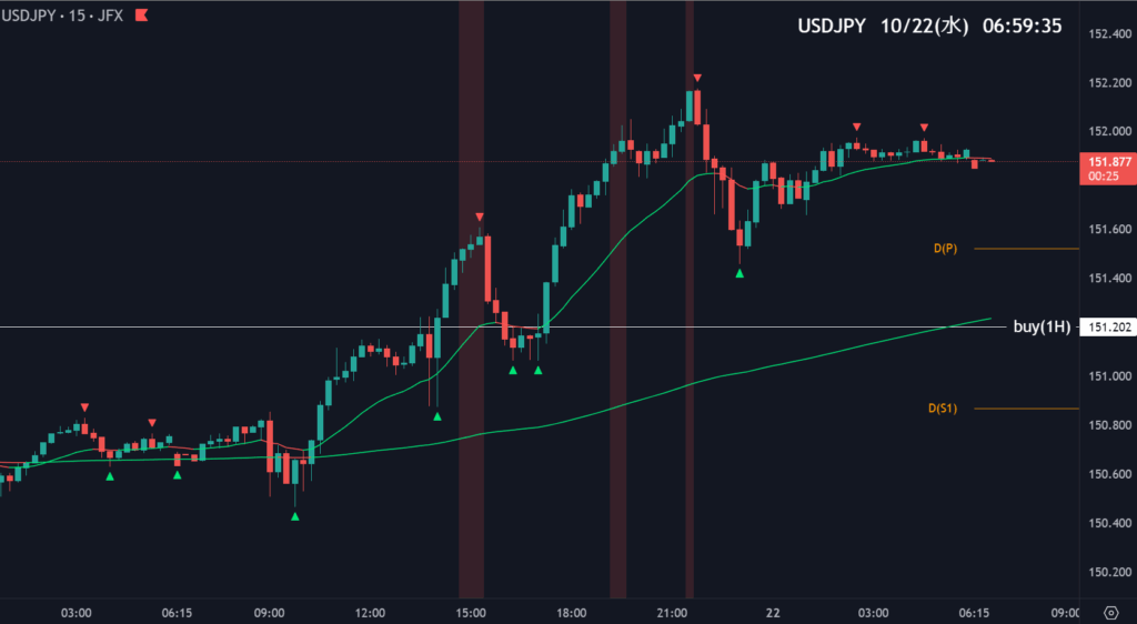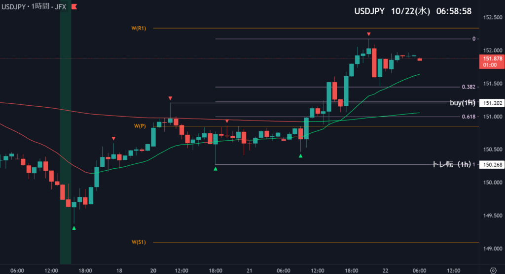 相場自体は既に織り込まれていたので、決定直後は20pipsほど上下に動くだけでした。そこから上げていき、夜の初会見でも上下に動き現在は152円にいます。
