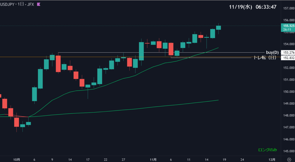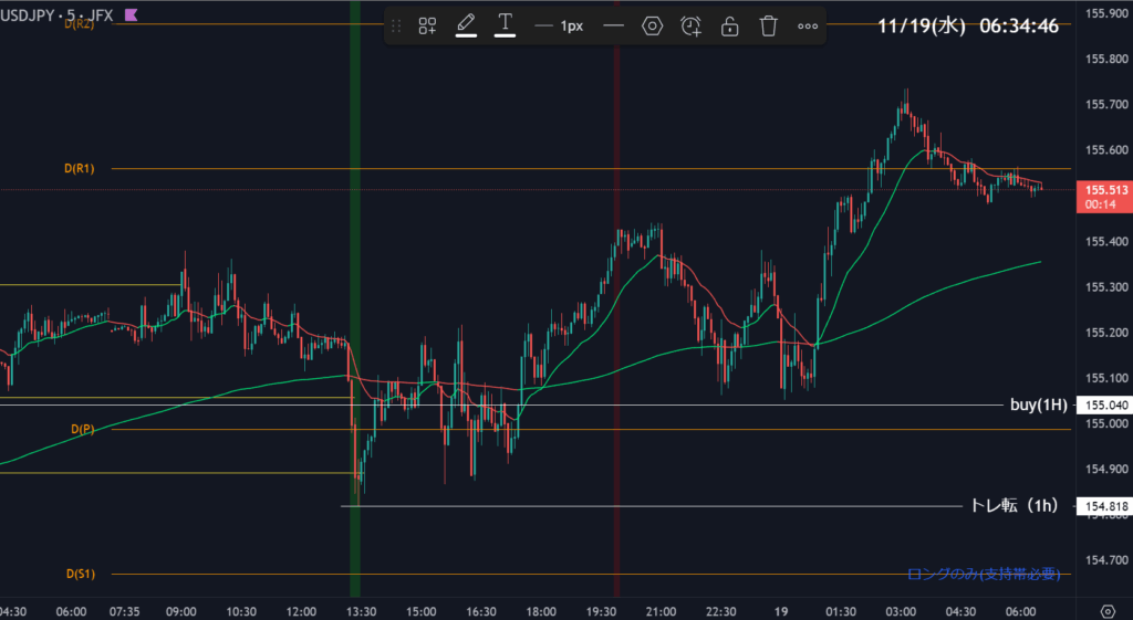 155.50より上にいる間はさらに強いロングトレンドなのでショートは打たないでいきましょう。