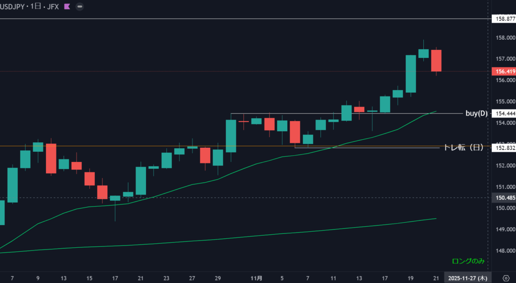 日足は20EMAか154.444ライン付近での押し目買いを狙っていきましょう。