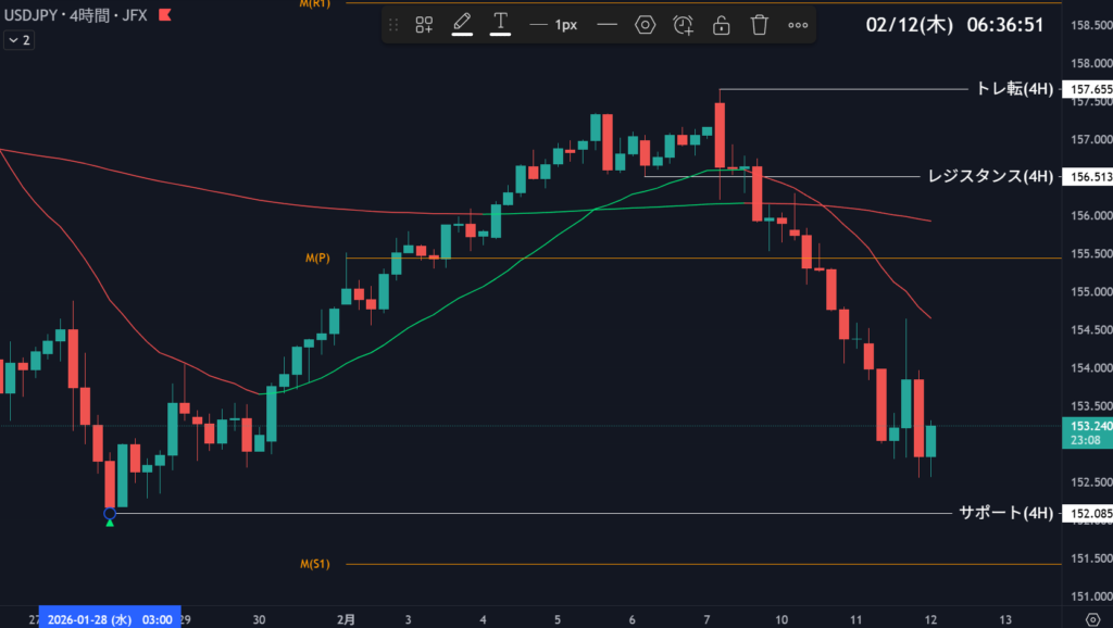 ここを割っても前回安値があるので、下がってくるとショートが打ちにくくなります。しかし目線自体は154.000を明確に抜けていかない限りは下に固定していきましょう。